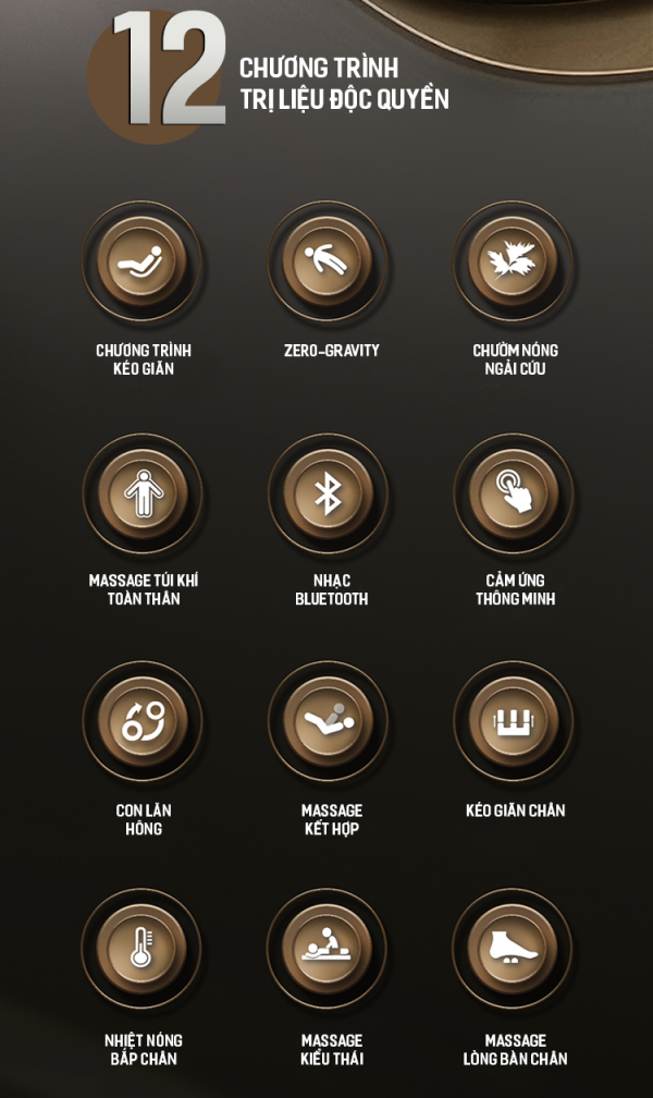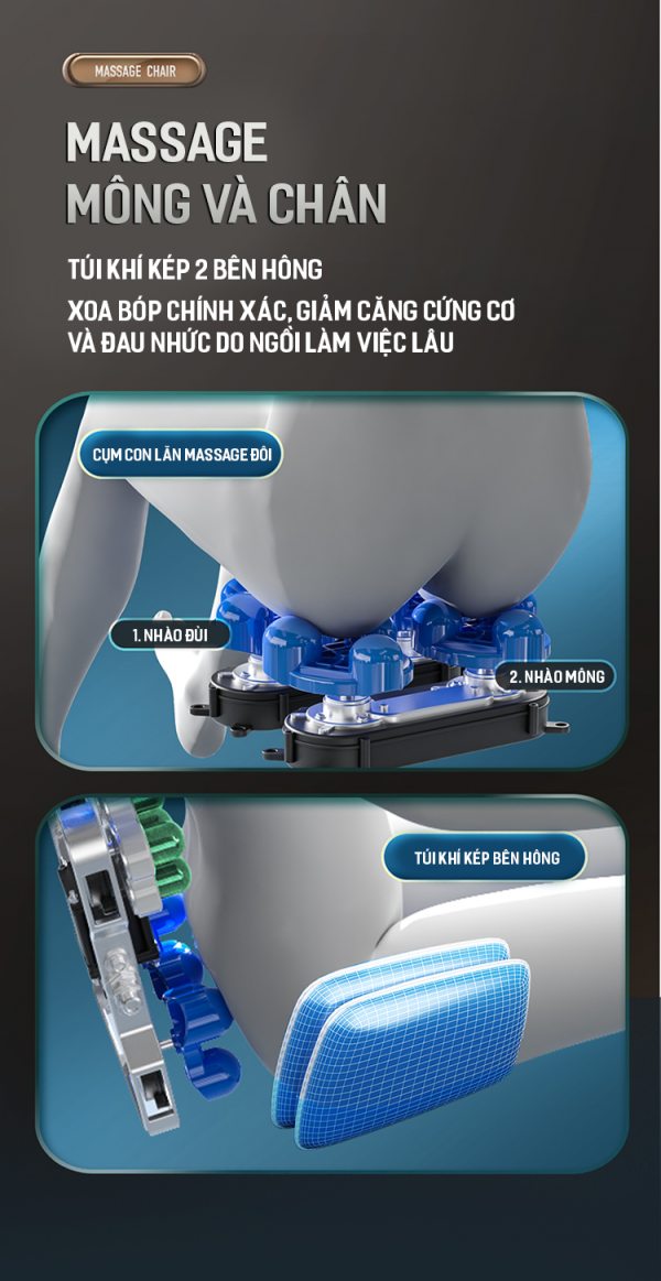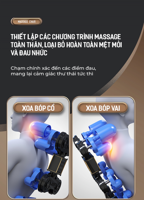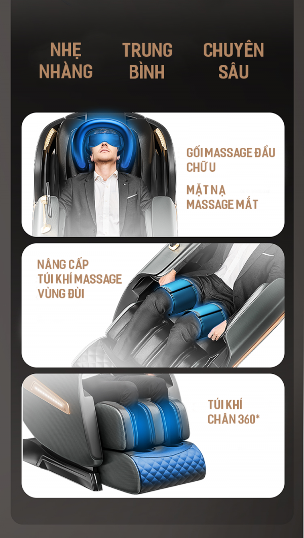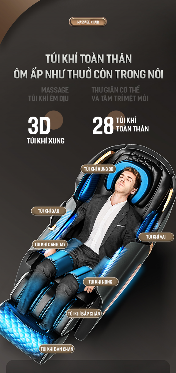Ghế massage là thiết bị chăm sóc sức khỏe thông minh và hiện đại với rất nhiều tính năng như: Hệ thống con lăn tích hợp cảm biến, rung massage, hệ thống túi khí, chế độ nhiệt hồng ngoại, con lăn mát xa cho chân, chế độ không trọng lực. Ghế massage hiện đại được lập trình để thực hiện nhiều phương pháp massage khác nhau với kỹ thuật massage điêu luyện.