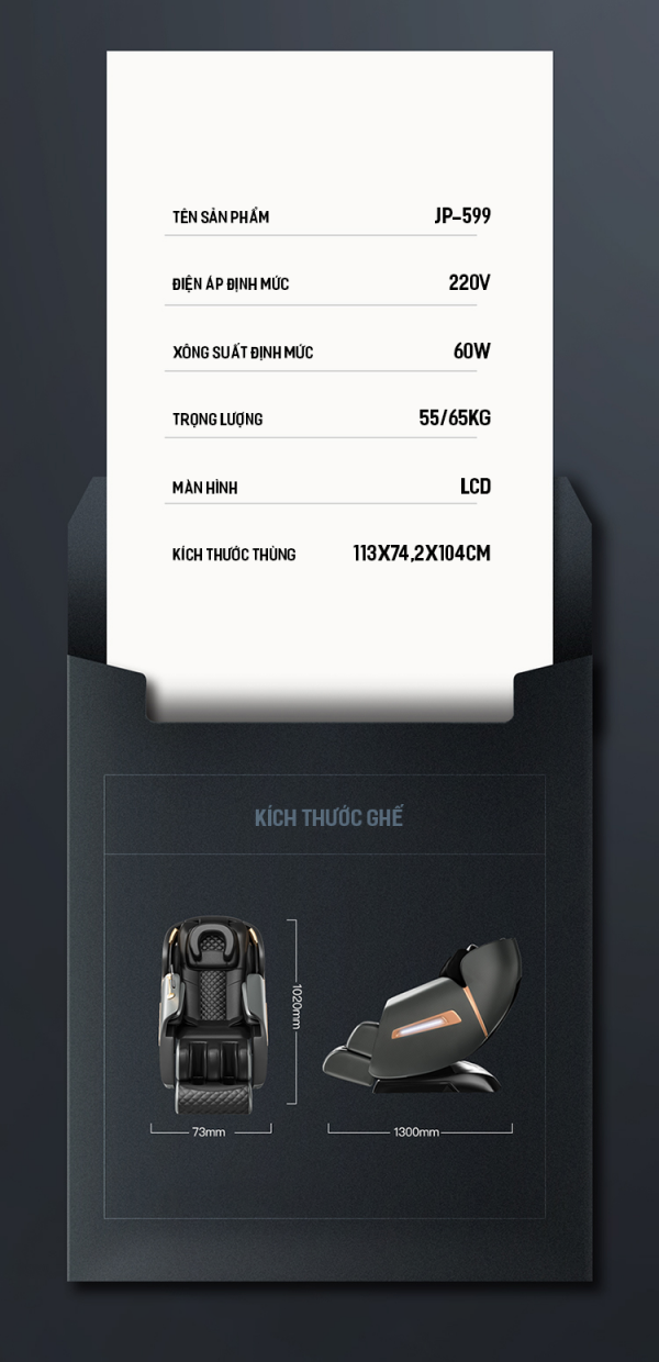 Bạn sẽ ngay lập tức cảm thấy tốt hơn nếu như bạn đã đầu tư một chiếc ghế massage, và có thể tận hưởng cảm giác được chăm sóc sức khỏe mỗi ngày. Ghế massage thư giãn trị liệu Japa-599 là sản phẩm đáp ứng được nhu cầu mà bạn đang cần, Hãy sở hữu ngay 1 chiếc cho bạn và cho những người thân yêu trong gia đình bạn nhé.
