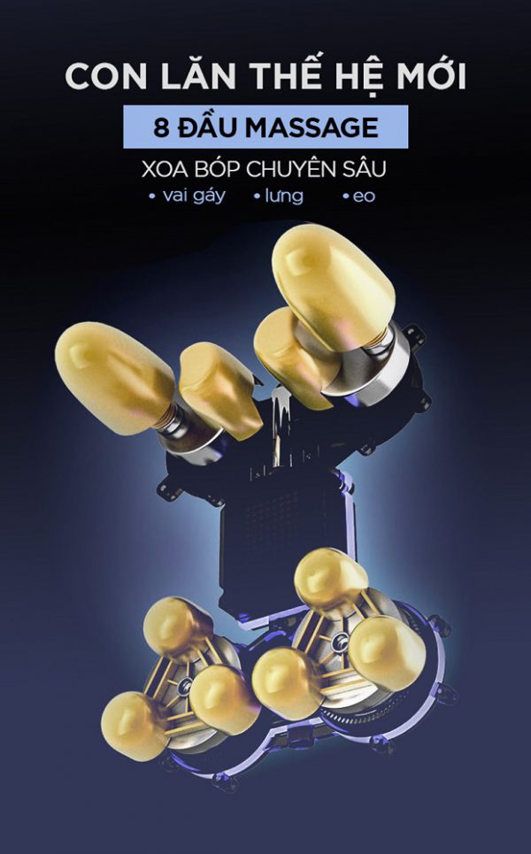 Con lăn thế hệ mới với 8 đầu massage, mát xa đa điểm vượt trội, tác động đến toàn bộ phần trên của cơ thể, bao gồm vai gáy – lưng – eo đem lại cảm giác thư giãn chân thật như đang được xoa bóp – bấm huyệt bởi bàn tay của chuyên gia trị liệu.