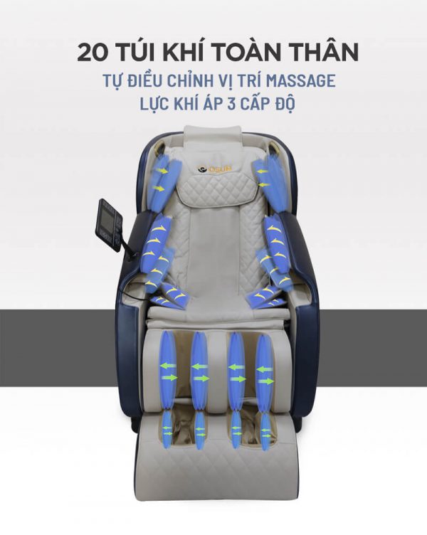 20 túi khí toàn thân chạy dọc thân ghế với những túi khí lớn xoa bóp cho những vùng cơ lớn thường xuyên bị nhức mỏi như: Bắp chân – tay – vai,… Túi khí cung cấp lực khí áp theo 3 cấp độ: Nhẹ – trung bình – mạnh, cùng khả năng tự điều chỉnh vị trí massage phù hợp với thể trạng của người sử dụng.