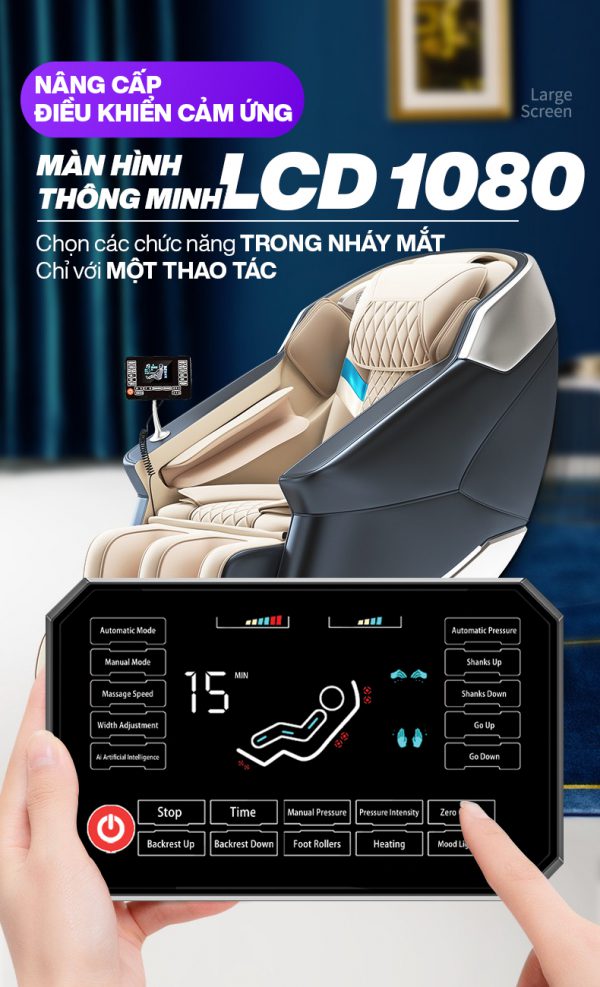 Ghế massage Japa còn được tích hợp màn hình cảm ứng màu LCD thông minh, giao diện thân thiện, dễ dàng sử dụng. Cùng hệ thống âm thanh kết nối bluetooth, vừa massage thư giãn vừa đắm mình trong âm nhạc.