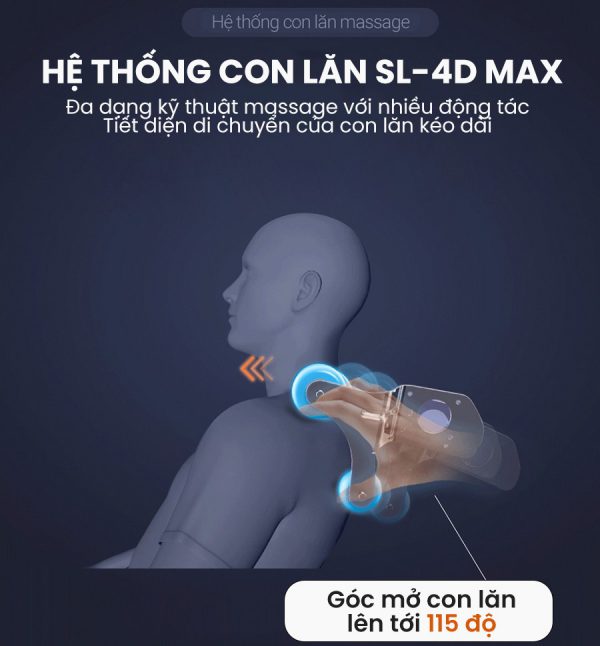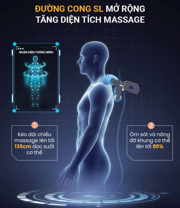 Thiết kế khung massage SL hiện đại giúp tăng 60% diện tích massage của cơ thể. Đồng thời khung sườn với chất liệu thép không gỉ cao cấp giúp nâng đỡ chắc chắn cơ thể khi ghế đổi tư thế. Nhờ đó làm giảm áp lực lên cột sống, cho ghế thực hiện chế độ kéo giãn toàn bộ cơ thể dễ dàng để đạt hiệu quả massage tốt nhất.