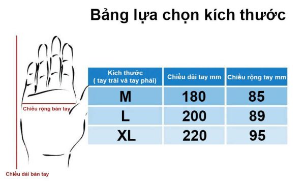 - Có thể tùy chọn găng tay trái hoặc tay phải theo bên tổn thương, kích cỡ mỗi tay đối chiếu theo bảng phía dưới