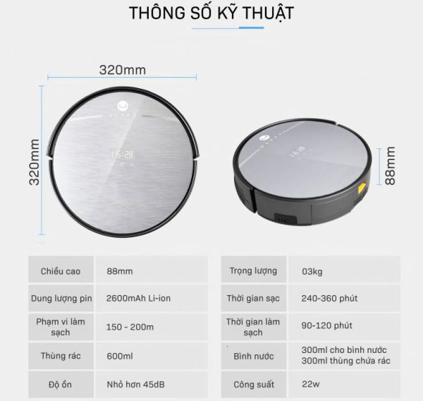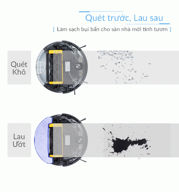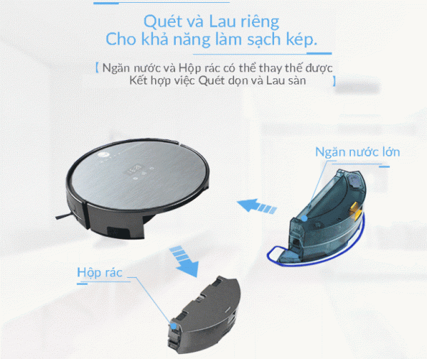 - Khoang quét lau bao gồm ngăn chứa rác và ngăn chứa nước độc lập: Robot có thể vừa thu dọn rác vừa lau sàn trong cùng một lúc