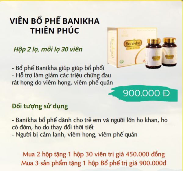 - Bổ phế đông trùng hạ thảo Banikha có hiệu quả trong việc hỗ trợ điều trị ho do thay đổi thời tiết, ho gió, ho khan, ho cảm, khản tiếng, ngứa rát cổ họng, viêm phế quản, viêm đau họng.