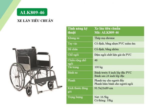- Nhờ sử dụng lốp đặc và khung xe chắc chắn mà xe lăn tay HDM ALK809-46 (BLP) có tải trọng người sử dụng lên đến 100kg.