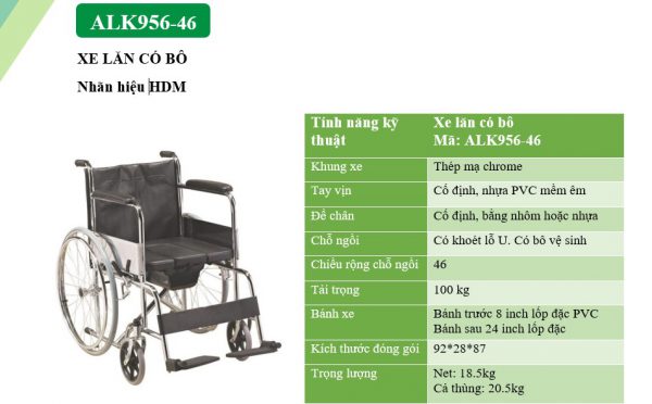 - Xe lăn tay HDM ALK956-46 thiết kế có bô giúp người nhà, y tá vệ sinh cho người bệnh dễ dàng hơn. Chỗ ngồi có khoét lỗ U để đặt bô vệ sinh phía dưới.