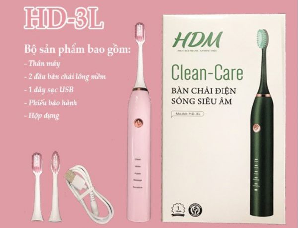 - Bàn chải điện dành cho người lớn HDM HD-3L sử dụng công nghệ rung sóng siêu âm tần số cao kết hợp 5 chế độ làm sạch chuyên biệt giúp loại bỏ mảng bám hiệu quả gấp 99,95%, sạch sâu khoang miệng, massage chăm sóc nướu.
