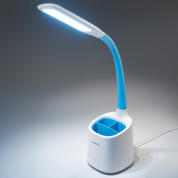 - Cổ đèn có thể quay linh hoạt. Đèn tích hợp hộp đựng bút, khi không cần đến bạn có thể tháo rời ra được.