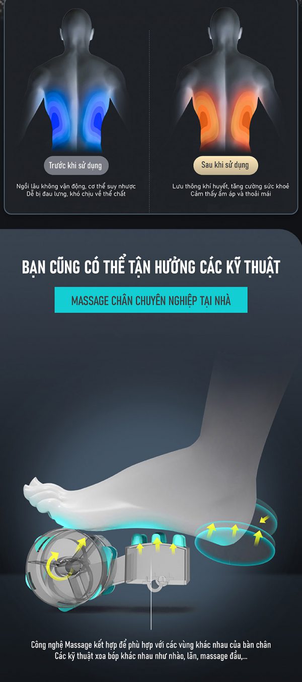 Ghế massage toàn thân Osun SK-366 còn được thiết kế hệ thống con lăn massage riêng cho chân. Các con lăn mát xa cạo gió gan bàn chân, tác động sâu vào phần hõm của gan bàn chân, từ đó kích thích các huyệt đạo ở chân, cải thiện khả năng hoạt động của các cơ quan nội tạng thông qua hệ thống huyệt và dây thần kinh liên kết ở chân.