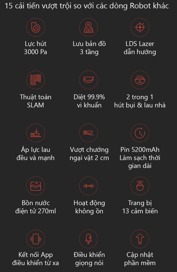 - So với những dòng robot thông thường khác, Robot hút bụi lau nhà Dreame D9 với 15 cải tiến, nổi bật trong đó là động cơ không chổi than Nidec của Nhật cùng lực hút siêu mạnh lên đến 3000 Pa giúp hút được nhiều bụi bẩn trong không gian nhà, kể cả bụi bẩn siêu nhỏ. Nhờ đó thiết bị có thể làm sạch sâu và tiêu diệt vi khuẩn lên đến 99%. Thiết bị này cũng hỗ trợ hai chức năng trong một đó là vừa hút bụi, vừa lau nhà.