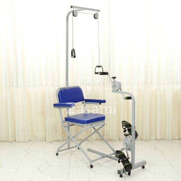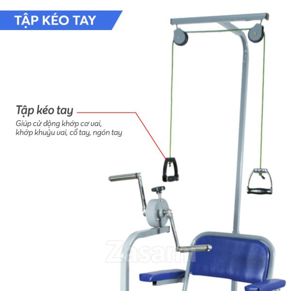 Tính năng: Phần tập kéo tay với hệ ròng rọc nếu người bệnh không thể giữ bàn tay trên tay kéo có thể sử dụng thêm bao tay bó vào cổ tay bên phần bị liệt. Phần tay không bị liệt sẽ dùng lực và kéo phần tay bị liệt hay khó cử động lên cao, khi này người bệnh sẽ dùng ý chí và phản xạ để hạ phần tay bị liệt xuống thấp. Người bệnh nên chăm chỉ tập luyện thường xuyên giúp bên tay bị liệt phản xạ và cử động trở lại bình thường.