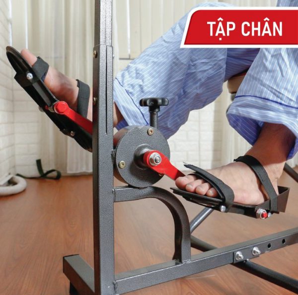 - Bài tập đạp xe cho chân: Giúp tăng cường hoạt động các khớp: Khớp nối cột sống, khớp đầu gối, khớp háng, cổ chân… từ đó tăng cường sự hoạt động trở lại của cơ chi dưới. Cách tập: Người dùng ngồi trên ghế tập, chân để lên bàn đạp, cài quai, đạp tiến về phía trước hoặc lùi về phía sau.