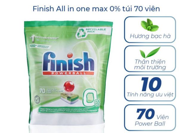 Viên rửa bát Finish Powerball 0% có ưu điểm là không mùi, không hóa chất, thân thiện với môi trường và tẩy rửa, làm sạch bát đĩa hiệu quả nhất.